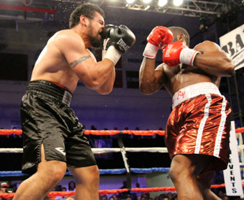 The rugged action resumed in round five with both big men fighting for the advantage. Finally as Jennings maneuvered Tupou along the ropes, he thumped his foe with a left hook and then that rocket of a right uppercut took off. Jennings launched the final blow straight up and under Tupou's guard. It landed hard on Tupou's chin and made his knees buckle. Immediately Tupou slammed to the canvas, and lying flat on his back, stared straight up with a grimace on his face. He didn't move for the better part of the count, but then gamely rose to his feet. However the referee prevented him from going on.