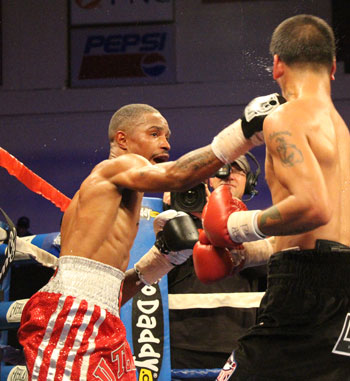 With a rowdy North Philly crowd and a wide audience watching at home, Hunter took Belmontes to school in the ring. Despite a deep amateur resume of his own, the "Corpus Christi Kid" could not match skills with the West Philadelphian. Hunter sent his message early on, landing a few good hard shots to his opponent's head and working the body well. Belmontes jabbed, but failed to land with significance, while Hunter attacked with his foot on the gas. More effective body work and a hard right hand found the mark as the first round ended.