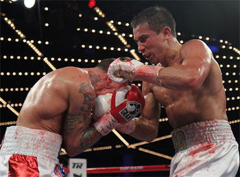 In the third round, Golovkin's right hand started landing more and more. Rosado stayed elusive for part of the round, but as the clock ticked, he slipped fewer and fewer of the shots. The punches were hard enough to take their toll on Rosado's flesh. The cut over his left eye became a pair of slits, both bleeding freely. However, as Rosado broke down physically, his heart fought all the harder. He stayed in the fray, but could never turn the tables. GGG fought like the tide. At first you think you can out-swim it, but in the long run, you realize it's going to get you. The champion continued to grind away in the fourth, landing subtly but always stepping up the pressure, while Rosado moved, but failed to land much. At the end of the round just before the bell, Rosado dug in and let loose a stiff right hand that stopped Golovkin in his tracks, but there wasn't enough time for him to turn it into anything.