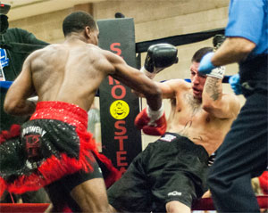 In the scheduled 6-round semi wind-up, southpaw Derrick Webster, Glassboro, NJ, returned from a one-year layoff to stop Julio Garcia in round five of their super middleweight bout. The fight got off to slow start, and after a few rounds the Armory crowd started getting bored. Webster was dominating the fight but seemed satisfied with a one-sided shutout. However, the crowd let it be known that they did not share Webster's complacency. In round four, the restless crowd began to boo. At first, Webster did not hear them. However, as the volume of the boos started going up, suddenly Webster took notice. Suddenly he stopped fighting and glanced up at the bleachers, only to hear more, and even louder boos.