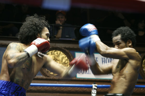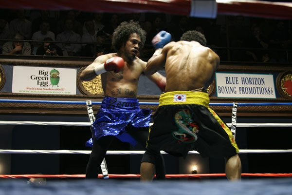 October 21: ROSADO UPSET AT BLUE "King" Gabriel Rosado was dealt his first professional loss by Chris Gray last night at the Blue Horizon. Gray came to fight, and after a slow start, gained the con-fidence & pluckiness to pull the upset. The fate of threes and Rosado's shoddy defense were Gray's accomplices in the hostile environment of a pumped up pro-King crowd. Rosado became the un-lucky 3rd local prospect this week to taste defeat for the 1st time, but his lackluster performance, low-lighted by poor defense & lack of activity, really did the deed. Photo of Gabe's best shot.