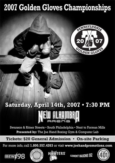 PA EASTERN REGIONAL GOLDEN GLOVES TONIGHT The 2007 Pennsylvania Eastern Regional Golden Gloves tournament finals will be held tonight, Saturday, April 14 at the New Alhambra in South Philadelphia (Swanson & Ritner Streets). Bouts in all weight classes will be staged in both the Novice and Open classes with the winners moving on to the next round of the nationals. The fights begin at 7:30 PM, with tickets available at the door for $20. Local amateur tournaments like these are always a good show and serve as a glimpse of the city's boxing future.