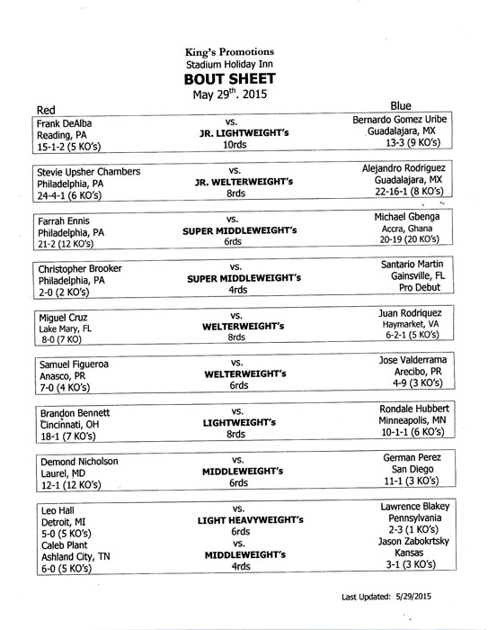 Frank De Alba vs. Bernardo Gomez Uribe May 29, 2015 - Philadelphia Stadium Holiday Inn No Program / Bout Sheet