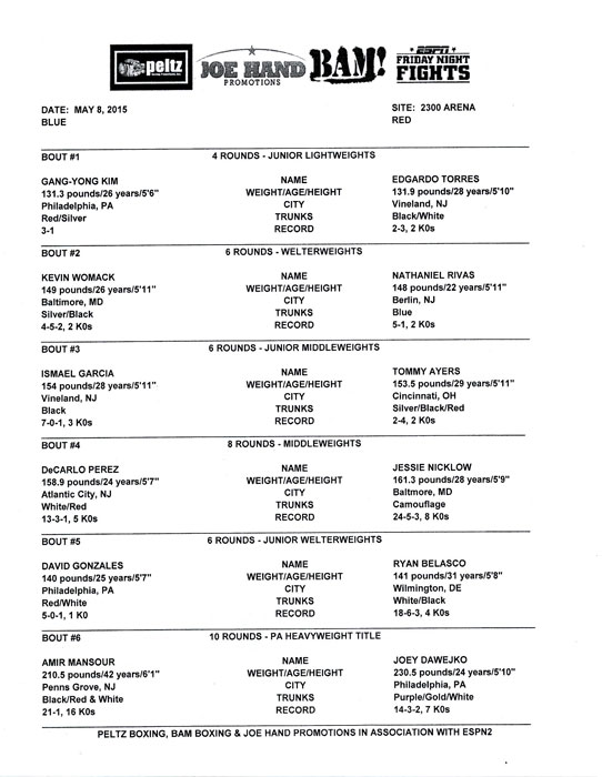Vyacheslav Shabranskyy vs. Paul Parker June 30, 2015 - Philadelphia 2300 Arena No Program / Bout Sheet