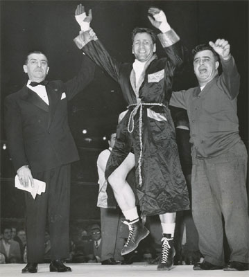 the first bout, and many thought he I don't know what Lesnevich's thoughts were on the subject, but that night he introduced the trap play into boxing. At the bell, the champion and the challenger advanced cautiously toward each other. Lesnevich was known as a very slow starter, so I'm sure Fox wasn't surprised when Lesnevich grabbed him in a quick clinch. The referee broke them, and Gus quickly grabbed Billy a second time. They separated and Gus clinched again. You could see by the look on Billy's face that he was surprised at the clinching tactics of the champion. After the third clinch, Lesnevich moved toward Fox as though he would clinch again. Not to be outdone, Fox dropped his guard and so he could get a better grip on Lesnevich. But, wham! - it was no clinch. Gus fired a right-hand shot to Fox's unprotected jaw. It landed with terrific force right on the button and Fox went down and out in round one. Lesnevich was the winner and still champion, because of a well-executed trap play. |