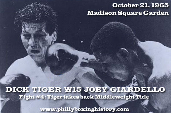Joey Giardello and Dick Tiger fought each other for the fourth and final time on this date in 1965. Tiger won the bout and evened their series at two wins each. More importantly, Tiger won back the world middleweight title that Giardello had taken from him almost two years before in Atlantic City. All four fights between these two old pros went the distance, with each winning a 10-round non-title bout and a 15-round championship bout. Giardello fought only four more times, retiring two years later. Tiger lost this title in his next defense (vs. Emile Griffith), but moved up in weight and became light-heavyweight champion in 1966. |