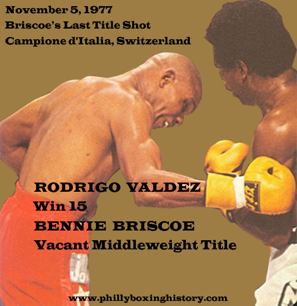 | 1977 - Rodrigio Valdez W15 Bennie Briscoe III at Casino Municipale in Campione d'Italia, SWIZ | ||||