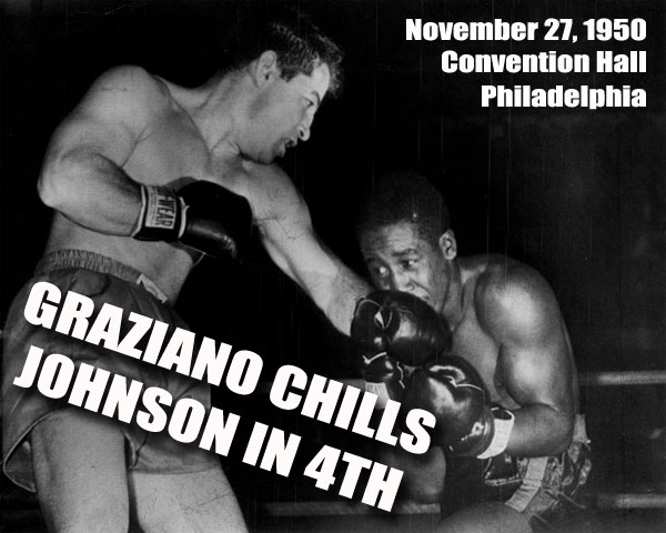 GRAZIANO CHILLS JOHNSON Rocky Graziano put the chill on Honey Chile Johnson 48 seconds after the bell started the 4th round of their battle before 8,500 fans at Convention Hall last night. It was a right that did the trick, the kind of right they use in fiction stories. It swept up and over Johnson's left and hit his jaw and he just fell away from it, slid away, and went down, turned over on his belly, and was counted out. It was a punch he had been asking for ever since the first bell of the first round sent the two into action. Instead of fighting the smart way and taking advantage of his greater speed and skill, Honey Chile went into the fight as though it were all his and just a matter of time. You got the impression Johnson was the fellow with the knockout punch and Graziano was the boxer. In other words, he reversed roles. It wasn't a bad idea, either, for a certain length of time, and in the second heat he split the Rock's eye with a looping right. He turned around with another punch. He looked like a killer. But then the Rock threw his right, and values reassumed the norm. Honey Chile went down for good., not to get up. Referee Charlie Daggert could have kept right on counting to 100. The amazing feature of the fight was that it went so long with Honey Chile using these tactics and charging in to trade punches instead of trying to keep out of range and pile up points for a decision victory. He not only surprised the fans but he also surprised the Rock, who could hardly believe his eyes, until one of them opened. Then he wound up and took what the kids call dibs on the Johnson chin and it was all over but cleaning the ring. In the semi-final, Rudy Cruz, of California, upset Arthur King in 10 rounds after King had two beats taken from him for out of bounds punching and what they call unnecessary roughness on Franklin Field. Jimmy Flood kayoed Jimmy Hayden in one round; Gil Turner stopped Joe Brewer in One; Joe Giardella (sic) drew with George Roberts, and Joe DeLiberto stopped Joe Mayne.
