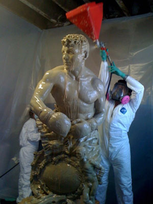 It took about two weeks, coat by coat, to cover the enormous figure. Just as dramatically as the image of Giardello had emerged over the past year as LeVotch worked, that same image of the former champ quickly disappeared under the heavy layers of latex. Still, the shape and impact of the statue remain, but the incredible detail of the old champ's face are merely a memory - for now. Currently, Ramos is building a plaster outer mother mold that will hold the latex in place. That step should be completed in the next week. After that, the mold will be cut away and transported to the Laran Bronze Foundry in Chester, PA for the final stage - the bronze casting. Stay tuned for updates on that stage over the next weeks. The dedication date for the final work has not yet been set. However, we expect to place the bronze on Passyunk Avenue in late October or early November. However, the project still needs some funds to complete the venture. So, it's not too late to get involved and help make this exciting effort a reality. Find out how you can become a part of it at www.joeygiardello.net.