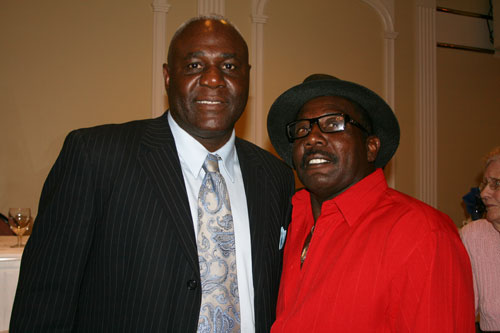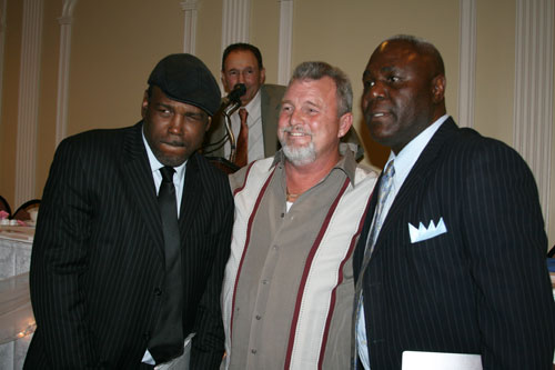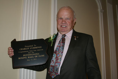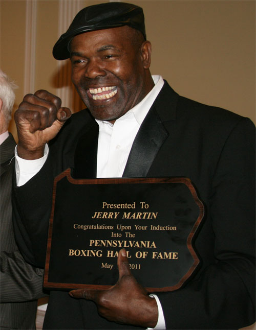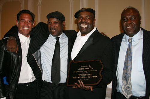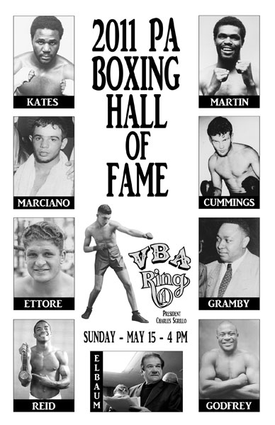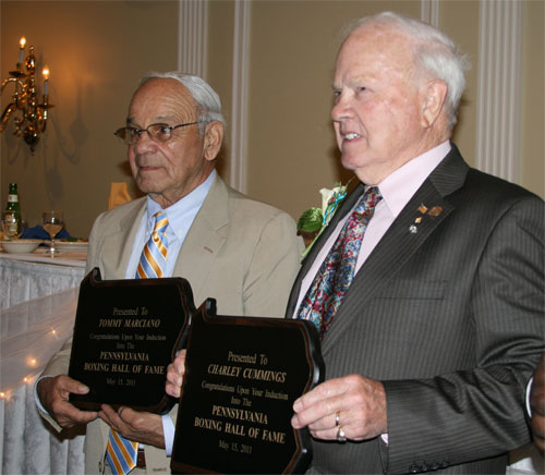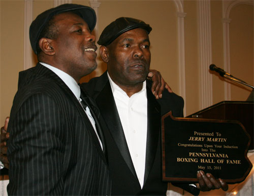 KATES AND MARTIN Boxing stars past and present came out to Romano's Caterers on Sunday, May 15, to celebrate the annual Pennsylvania Boxing Hall of Fame inductions. Leading the pack this year were a pair of outstanding light-heavyweights, Richie Kates and Jerry Martin. Both men were world title challengers during a golden era of 175-pounders. Also inducted Sunday were Tommy Marciano, Charlie Cummings, promoter/match maker Don Elbaum, Olympic champion David Reid, fight manager Joe Gramby, and heavyweights George Godfrey and Al Ettore. Kates, Martin, Marciano, Cummings, and Elbaum were all in attendance. David Reid was not present, so ring announcer and former VBA President Hank Kropinski accepted for him. Margaret Stull, the ninety-year-old daughter of local boxing icon Jim "Baron" Dougherty, spoke for deceased heavyweight legend George Godfrey. Dougherty was the boxer's manager. Godfrey trained and lived with the family during much of his career. He was very much a part of the family explained Ms. Stull. Promoter Russell Peltz accepted the honor for the deceased Gramby, saying "if Joe Gramby wasn't the greatest Philadelphia fight manager, I don't know who was." Vince Ettore, the son of West Philly star Al Ettore came from his home in Florida to accept his father's award. The quiet and classy Kates accepted his Hall of Fame plaque and thanked his family, manager Joe Gramby, promoter Russell Peltz and all his supporters. Kates mugged with his old rival Matthew Saad Muhammad on his way off the dais. Jerry Martin held his award high which delighted his large cheering section. Martin was the top ticket seller for this year's event. Martin acknowledged his trainer Leon Tabbs, who was there supporting him. Tommy Marciano said that during his fighting days he always dreamed of being a champion. "That never happened, but when I look at my family, I really feel like it did." Charlie Cummings thanked his large family as well as his trainer, the late great Wesley Mouzon, manager Marty Kramer, Joe Gramby, and ring rival-turned-friend Carmen Bartolomeo. Don Elbaum said that he felt proud to be included in such a strong class of inductees, and remarked that he'd love an opportunity to promote Al Ettore and Tommy Marciano today. Elbaum recapped the merits of each of his fellow inductees before accepting his own plaque. Former Cement Masons Union President Mike Fera and Cheese Steak King Joey Vento were both honored as the Veteran Boxers Association's "Men of the Year" in 2011 for the role each played in the Joey Giardello Statue Project. Artist Carl LeVotch presented a plaque to Mike Fera while Carmen Bartolomeo accepted for Joey Vento. Also on hand for the event were Stanley "Kitten" Hayward, Mike Rossman, Matthew Saad Muhammad, Gabriel Rosado, Garrett Wilson, Leon Tabbs, Vic Diamond, and many others. VBA President Charles Sgrillo, Vice President Bill Abel Sr., and Treasurer and HOF Chairman John Gallagher presided over the ceremony. Nino Del Buono was the Master of Ceremonies.