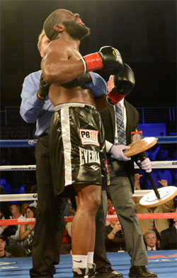 Bryant tumbled straight to the canvas, face-first. He rolled over and climbed to his feet, but the round was only about half over, and in heavyweight boxing, that is a death sentence. Ortiz immediately jumped on Jennings and a solid right had the wounded fighter wobbling against the ropes. Jennings tried to escape but an Ortiz left hand again hurt Bryant and almost returned him to the floor. As Jennings struggled to remain upright, referee Richard Pakozdi moved in to save him. The time was 2:41 of round seven.